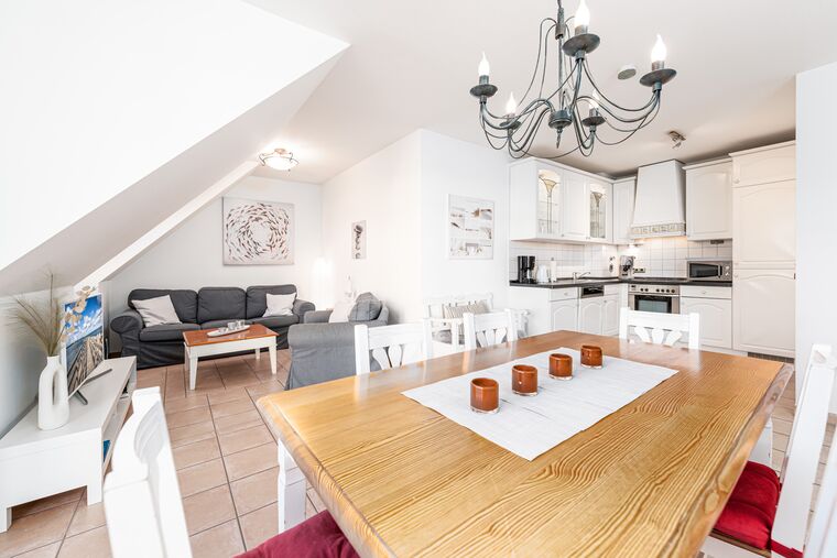 Der Wohnraum verfügt über eine gemütliche Sitzecke mit Kabel-TV und DVD-Player, einen Essbereich sowie über eine integrierte, modern und voll ausgestattete Küche mit Geschirrspüler und Mikrowelle.