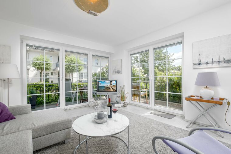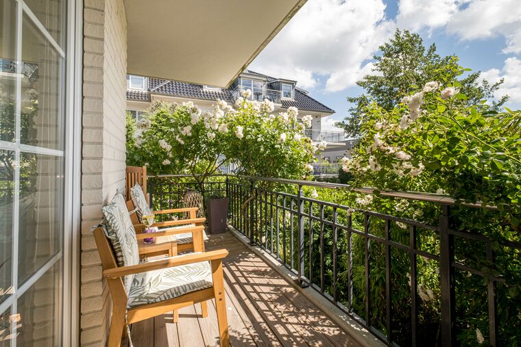 Der nach Süden und Osten ausgerichtete, umlaufende Balkon bietet sehr viel Platz, sodass Sie sich mit einer Tasse Kaffee oder Tee auch an der frischen Meeresluft und dem Ostseeflair erholen können.