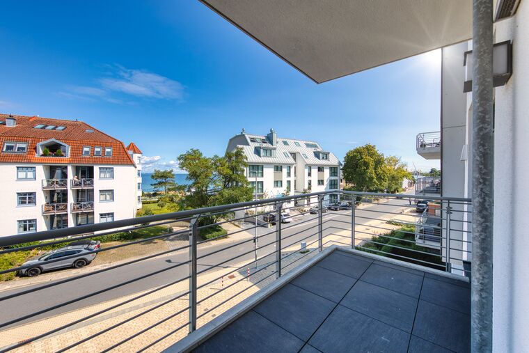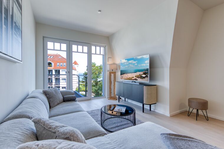 Zur Ihrer linken Hand gelangen Sie zum Essbereich sowie auch der sehr bequemen Couchgarnitur mit großem TV. Hier verbringen Sie entspannte Stunden mit der ganzen Familie. Vom Wohnraum aus betreten Sie den großzügigen Balkon, von dem Sie die frische Meeresluft und einen traumhaften Blick auf die Ostsee genießen können.