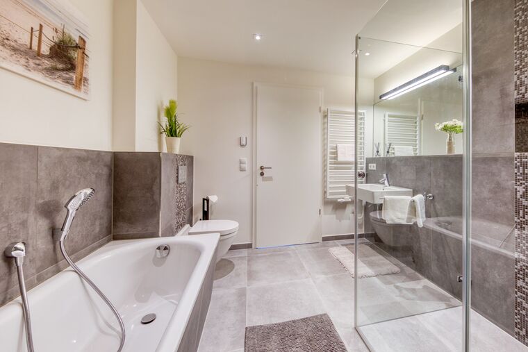 Vom Flur aus gelangen Sie in den Wohnraum, das Gäste-WC und auch in einen weiteren Flur, der den Schlafbereich vom Wohnbereich abtrennt. Von dort aus ist das Badezimmer erreichbar, welches über eine bodengleiche Dusche, eine Badewanne und einen Handtuchtrockner verfügt. Hinter dem Badezimmer ist auch noch ein Abstellraum mit einem Waschtrockner.