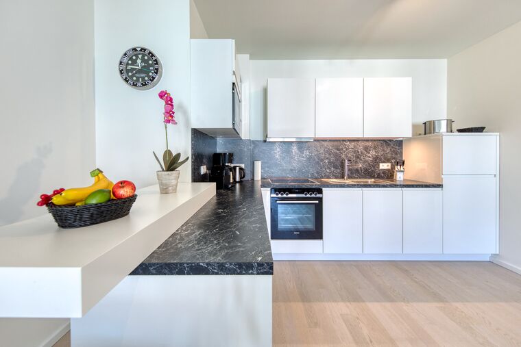 Wenn Sie den Wohnraum betreten, erstreckt sich zur rechten Hand die voll ausgestattete, offene Küche mit Backofen, Induktionsherd, Geschirrspüler und allen weiteren Dingen, die Sie zum Zubereiten toller Speisen benötigen. Da die Küche mit einem seitlich integrierten Tresen besonders viel Platz bietet, steht einem ausgelassenen Kochabend nichts im Wege.
