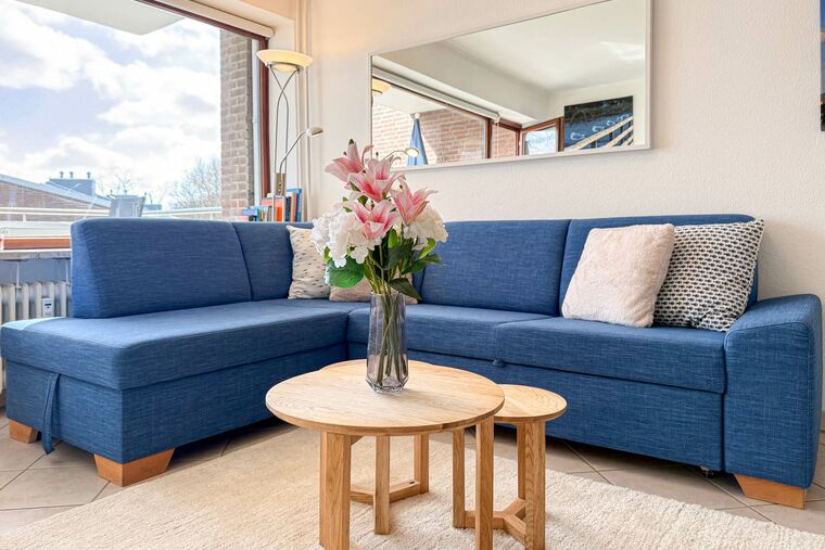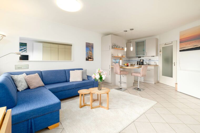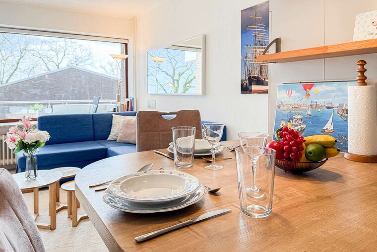 Das Appartement befindet sich auf der 1. Etage und ist bequem mit dem Fahrstuhl erreichbar. Der offene Wohnbereich bildet den Mittelpunkt der Wohnung und lädt mit einer gemütlichen Couch, einem Flatscreen-TV und einem flexiblen Essbereich zum gemeinsamen Verweilen ein.