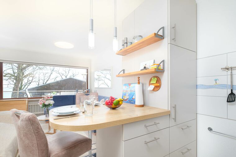 Die offene Küche ist funktional ausgestattet und harmonisch in den Wohnraum integriert. Neben einer Kaffeemaschine, einem Kühlschrank, einem Ceranfeld, einem Backofen und einem Wasserkocher steht Ihnen auch eine Mikrowelle zur Verfügung. Ein kleiner Tresen bietet eine zusätzliche Sitzmöglichkeit.