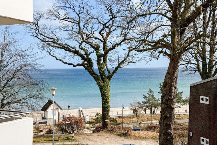 Vom Wohnbereich aus gelangen Sie auf den möblierten Balkon. Hier können Sie die frische Ostseeluft genießen und sich über einen seitlichen Blick auf das Meer freuen – ein schöner Platz für den ersten Kaffee am Morgen oder entspannte Stunden am Abend.