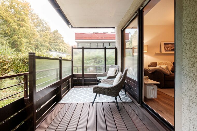 Vom möblierten Balkon in Süd-West-Ausrichtung genießen Sie fast den ganzen Tag die Sonne. Auch abseits des Strandes können Sie so Ruhe und Erholung tanken.