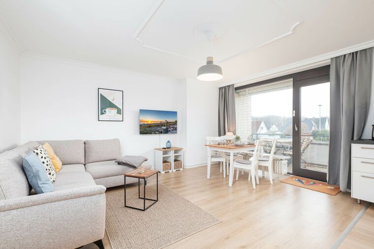Das Wohnzimmer verfügt über einen gemütlichen Couchbereich mit Schlaffunktion (140x200cm), Flatscreen-TV, einem gemütlichen Essbereich sowie eine offene Wohnküche mit u.a. Cerankochfeld, Backofen und Geschirrspüler.