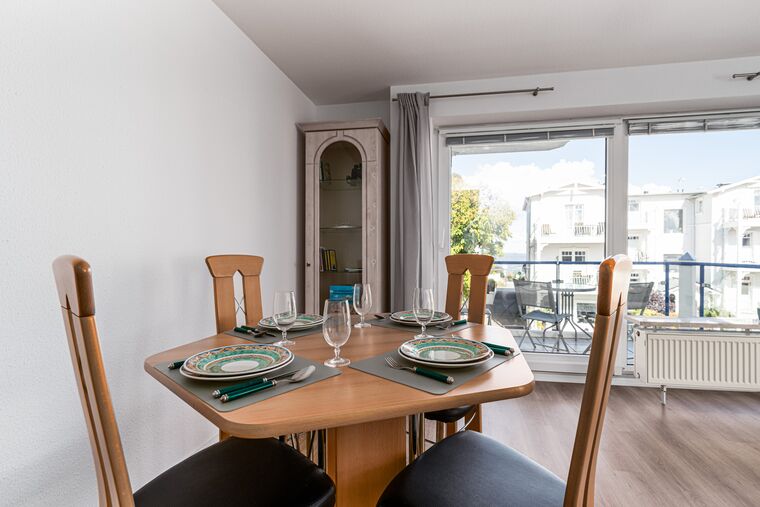 Es erwartet Sie ein großer und lichtdurchfluteter Wohnraum mit bequemer Schlafcouch, einem Essbereich und integrierter Einbauküche, der sich besonders gut für gemeinsame Kochsession's eignet. Des Weiteren steht für Sie ein Smart-TV mit integriertem Radio für Sie zur Nutzung bereit.