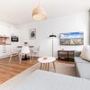 Das Appartement ist mit einer Küchenzeile mit Ceranfeld, Kühlschrank und Gefrierfach, Geschirrspüler, Kaffeemaschine, Wasserkocher und Toaster ausgestattet.