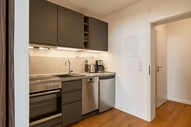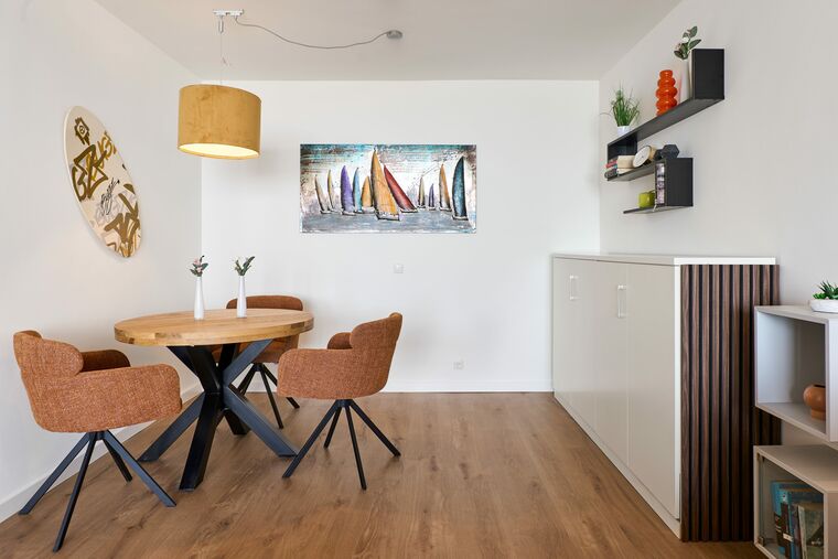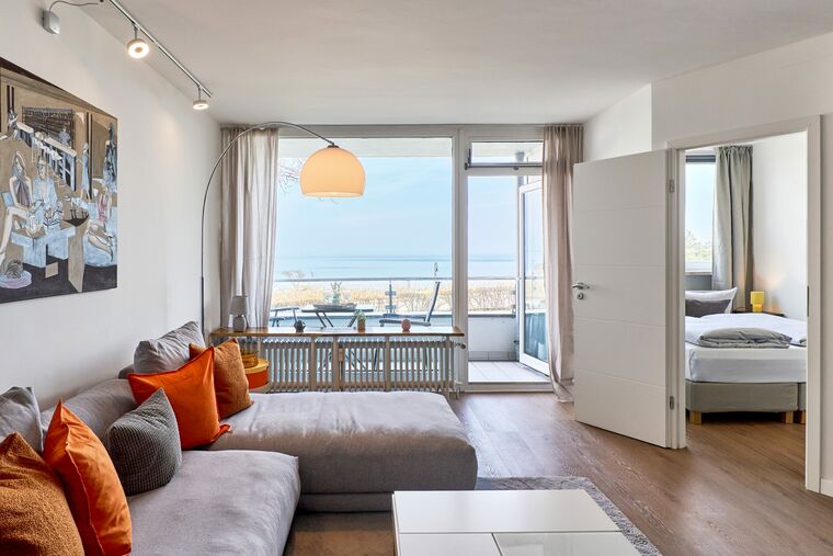 Ankommen und wohlfühlen. Diese 1,5 Zimmerwohnung bietet Platz für bis zu 3 Personen. Ausgewählte Design-Klassiker sorgen für eine modische und gleichzeitig gemütliche Atmosphäre. Im Wohn-und Essbereich erwartet Sie eine elegante Designer-Couch von Rolf Benz, von welcher aus Sie den traumhaften Blick auf die Ostsee genießen können. Ein Esstisch mit Platz für 3 Personen sowie ein Schrankbett und ein Smart-TV stehen für Sie bereit. Von dem Wohn- und Essbereich gelangen Sie auf den Balkon mit traumhaftem Ausblick. Genießen Sie eine Tasse Café oder Tee und lassen es sich bei dem Rauschen des Meeres gutgehen. Ebenfalls angrenzend an den Wohn- und Essbereich befindet sich das Schlafzimmer mit einem gemütlichen Doppelbett (1,60mx2,00m), einem Kleiderschrank sowie einen Smart-TV.