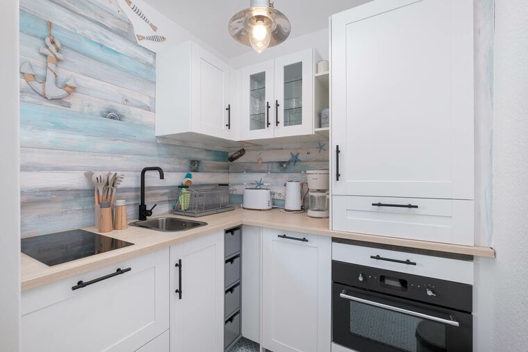 Die kleine, aber vollständig ausgestattete Küche bietet Ihnen ein 2-Platten-Induktionskochfeld, einen Kühlschrank mit Gefrierfach, einen Backofen, einen Geschirrspüler sowie einen Wasserkocher, eine Kaffee-Filtermaschine und einen Toaster.