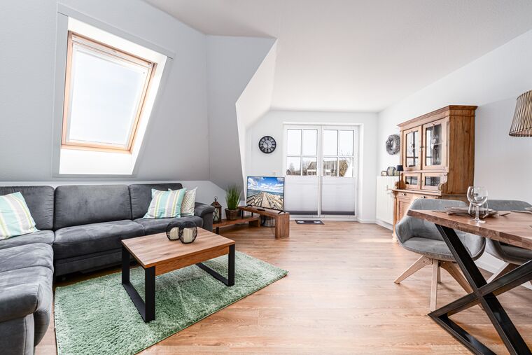 Begrüßt werden Sie von einem geschmackvoll eingerichteten Eingangsbereich mit Garderobe, von wo aus sämtliche Räume der unteren Ebene sowie die Treppe zum oberen Schlafzimmer zugänglich sind. Der lichtdurchflutete Wohnraum mit integrierter und sehr gut ausgestatteter Küche lädt zum Verweilen ein. Für gemeinsame Kochsession's sowie ausgelassene Spieleabende mit der ganzen Familie ist viel Platz vorhanden. Von hier aus gelangen Sie auch auf den Balkon, wo Sie den erlebnisreichen Urlaubstag entspannt ausklingen lassen können.