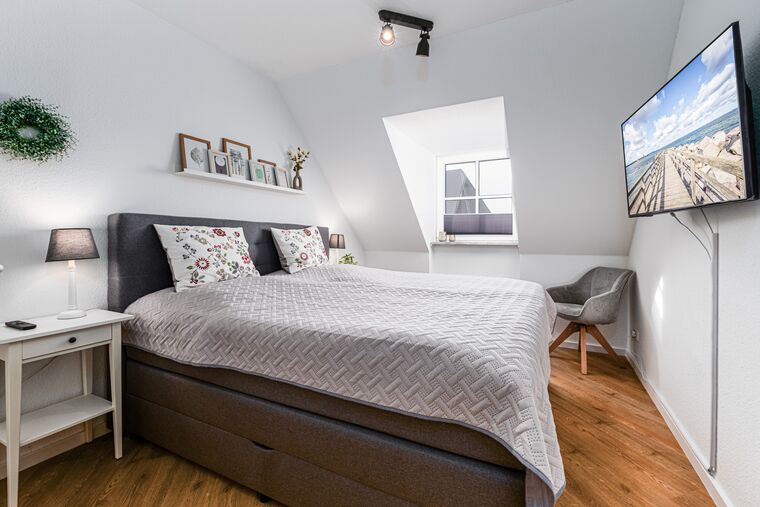 Das zweite Schlafzimmer ist über eine Treppe von Flur aus erreichbar. Das Zimmer ist geschmackvoll mit einem weiteren Sitzbereich und einem komfortablen Doppelbett eingerichtet.