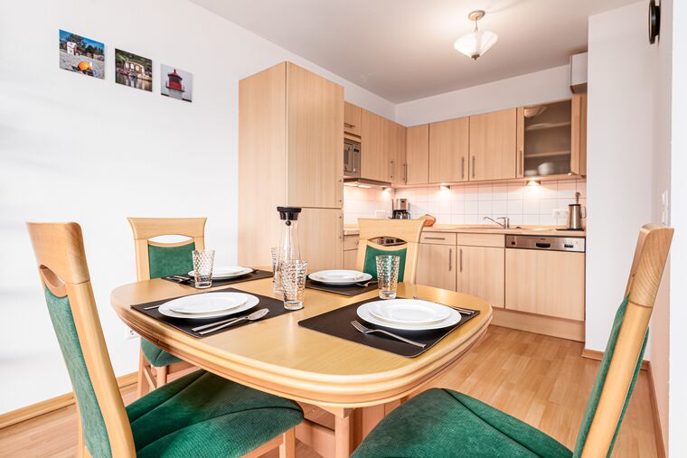 Vom Flur aus erreichen Sie das geschmackvoll ausgestattete Wohnzimmer. Hier befindet sich eine bequeme Schlafcouch (1 x 160 cm x 200 cm), ein TV sowie der Essbereich und die integrierte Einbauküche mit Geschirrspüler und Backofen.