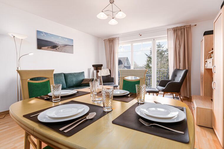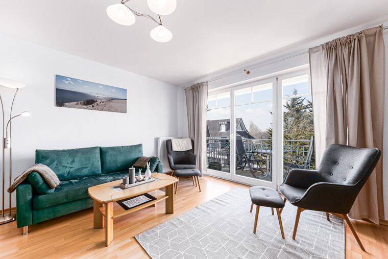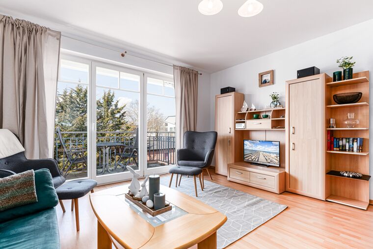 Von hier gelangen Sie auf den nach Westen ausgerichteten Balkon, von dem aus Sie sogar die Ostsee durch die Häuser auf der anderen Straßenseite erblicken können.