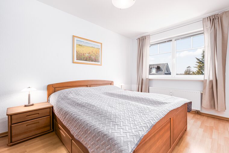 Das großzügig geschnittene Schlafzimmer mit Doppelbett (2 x 90 cm x 200 cm) verfügt über einen großen Kleiderschrank, der viel Platz für die mitgebrachte Urlaubskleidung bietet. Hier können Sie sich nach einem erlebnisreichen Tag an der Ostsee erholen und ausruhen.