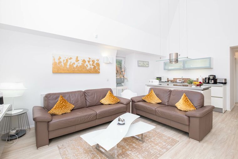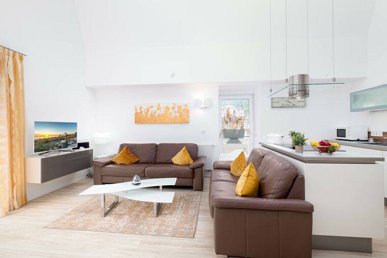 Sie betreten das großzügige 96 qm große Appartement in der ersten Etage. Dort empfängt Sie in der für maximal 6 Personen eingerichteten Wohnung ein offener Wohn- und Essbereich. Durch die hohen Decken genießen Sie Ihre Zeit in dem lichtdurchfluteten Wohnbereich. Von hier aus erreichen Sie ebenfalls den vorgelagerten Sonnenbalkon mit herrlichem Meerblick.