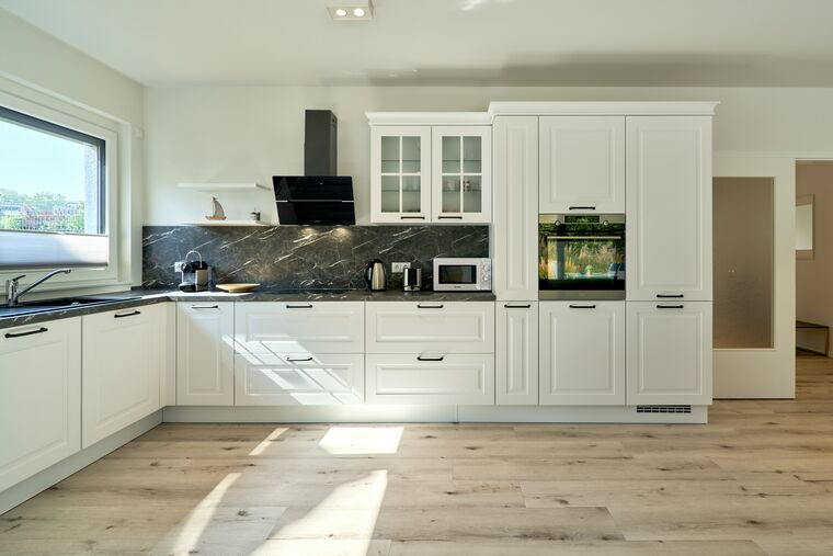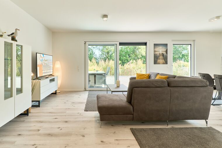Das große Wohnzimmer mit integrierter Küchenzeile, einem Esstisch ( Platz für 6 Personen ) sowie einem Wohlfühlwohnbereich. Rollläden